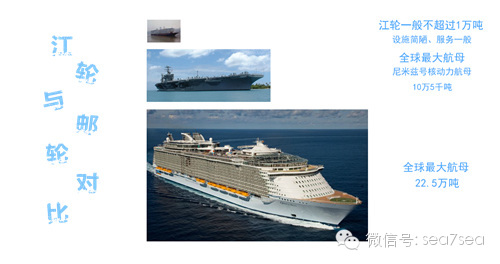 江河邮轮一般是在内河流域游览江河景观和途经城市,经常作为一种交通替代工具。江河邮轮船吨位小,设施、环境、服务都与海上邮轮相差甚远。海上邮轮最大吨位可以达到22.5万吨,相当于3艘航空母舰的吨位总和,其设施、环境、服务都是精心设计、严格培训的。