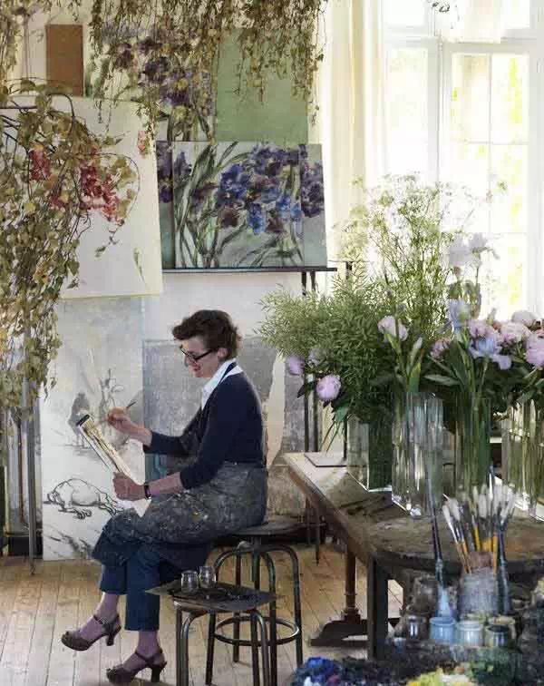 法国女画家克莱尔·巴斯勒,她不仅把花草植物画在油画布上,还画在墙壁上、画在瓷器上,爱花人以花为邻。她的工作室、卧室、藏书室都好像植物园。她的灵感全部来自与大自然的直接接触:一棵树的力量、一朵花的柔弱、树林内遮蔽的空间以及暸阔草原的震撼。