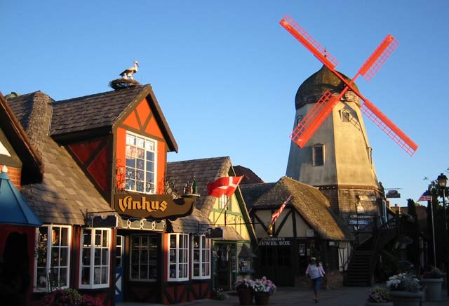 Santa Barbara西北面大约四十五分钟车程有一个小城市Solvang,中文一般俗称丹麦村Danish Village,这里是1911年由丹麦移民所建,Solvang就是丹麦语「充满阳光的田园」之意,北欧风格的镇上建筑,与今日丹麦古董老房子感觉几乎相同,让连从丹麦来的游客都讚嘆不已,从五十年代开始,这里成为西岸的重要景点,是最美丽最有特色的Downtown之一,这一带徒步逛街的范围相当不小,可以说没有甚么实际的事情做,但是附带风车的北欧式建筑,别緻独特的商店餐馆,令人彷彿进入童话的国度,由于都市法规的限制,这里没有连锁店文化侵入,可以说是今日氾滥的美国通俗文化少见的禁地,Solvang Restaurant有一种招牌食品Aebleskiver,这个食品的来由是古时候维京人将盾牌反转烤出球状饼食,流传至今日。镇里有一个室外的Solvang Festival Theatre,夏天表演一些传统的歌剧。比较大的活动是九月时的Danish Days有Torchlight Parade和Danish Days Parade,十二月的Winterfest Celebration有Christmas Parade。